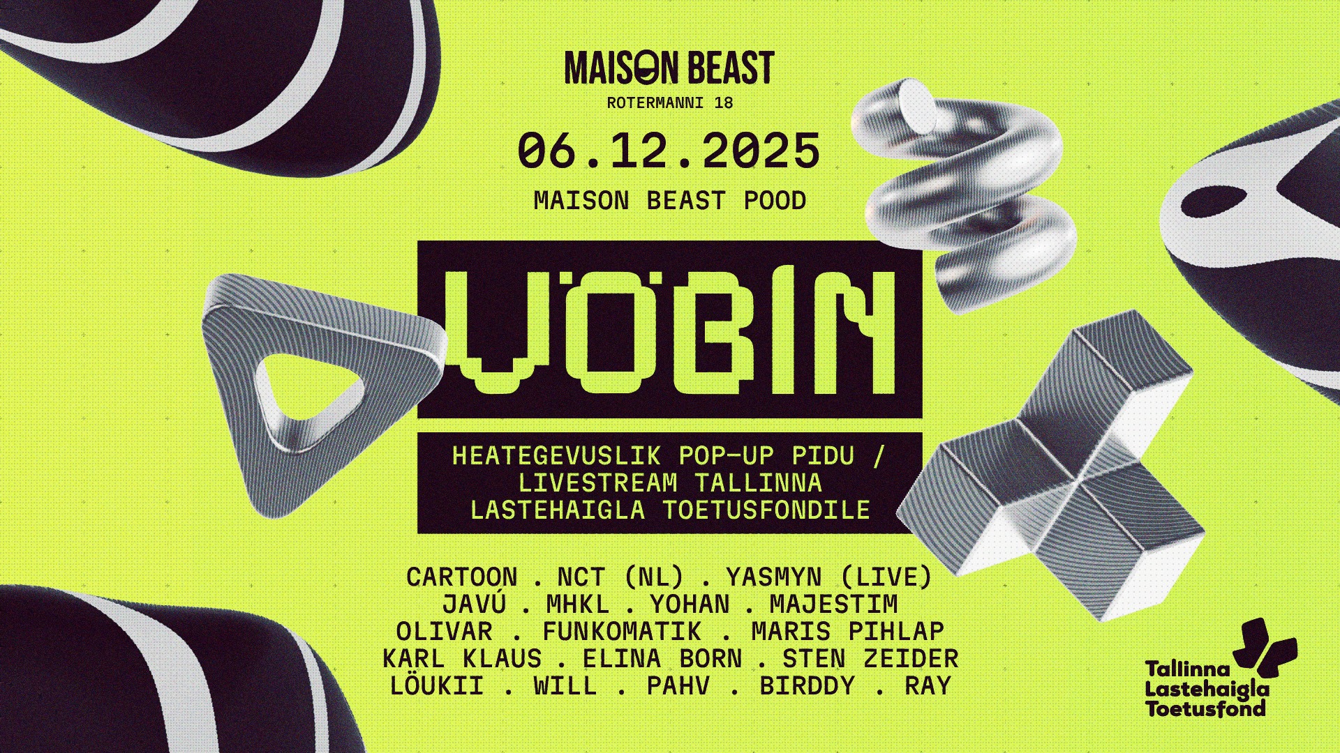 Heategevuslik Vöbin on tagasi, et 6. detsembril üheskoos teha head ning nautida üht ilusat päeva hea muusika ja super seltskonnaga! Asukohaks on korraldajad valinud mega ägeda Maison Beast poe Rotermannis, kus kaheksa tunni jooksul astuvad nii külaliste kui ka rahva ette tuntud artistid. Mõnusa heategevusliku päeva lõpetab Vöbina tarbeks jõud ühendanud Cartoon ja NCT!